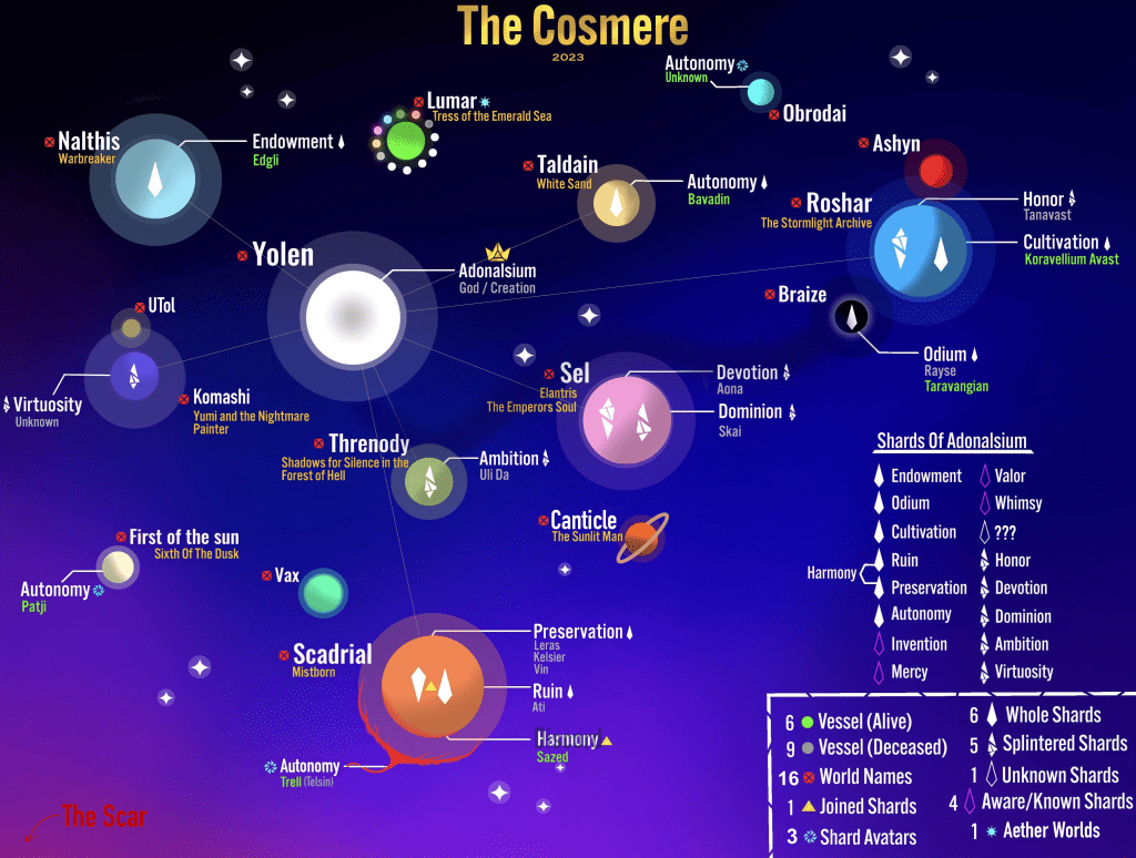 Well, it’s a universe, quite literally. Well, more specifically, it’s a universe populated by dozens of planets and solar systems. Many of these planets are barren, however, a select number of them have a “god” (or multiple “gods”) tied to them. These “gods” were once part of a single god, however, a group of sixteen people killed and shattered the god into pieces. Each of them got a “shard” which represents a personality trait of the original god. These “shards” made these people gods in their own right, but it also slowly shifted their personalities to the shard that they held. They would soon disperse to different planets, or create their own new planets, dictating the systems of the planet, creating life, and investing themselves in the very ecosystems of the planet (also known as investiture).